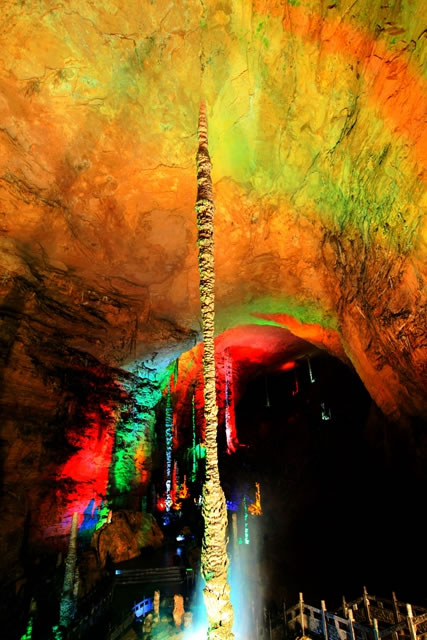 雪松是龍宮的第三大奇觀,也是黃龍洞內(nèi)生長速度最快的一根石筍,它通體雪白,高達17米,巍然聳立在龍宮大廳西端的斜坡上,“大雪壓青松,青松挺且直”就是它的真實寫照!把┧伞钡目茖W(xué)名稱叫棕櫚狀石筍,是洞頂?shù)嗡捌洚a(chǎn)生的飛濺水共同作用的結(jié)果,一般只有在空間較為高大的廳堂才能看到。根據(jù)其根部的棕櫚片取樣分析,“雪松”挺立在這里已經(jīng)有9.6萬年的時間了,因此也叫它“萬歲松”。