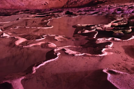 千丘田科學(xué)名稱為“流石壩”,也叫“酸田”, 它是水平流動的水在洞底流動過程中形成的碳酸鈣沉積。黃龍洞內(nèi)大大小小的千丘田不計其數(shù),縱橫阡陌,形似一片片頗為壯觀的田園風(fēng)光。