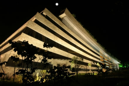 黃龍音樂廳位于生態(tài)廣場入口處,由黃龍洞投資股份有限公司按國際標(biāo)準(zhǔn)建設(shè),建筑面積為4970平方米,總投資1.6億元,座位818個。該音樂廳背靠植被茂盛的黃龍洞山體,面朝浩瀚的稻田,南鄰潺潺東流的索溪水。整個建筑為框剪式結(jié)構(gòu),3250平方米斜坡面屋頂全部為綠茵花草屋蓋,是全球最大的綠化屋頂;其外墻由當(dāng)?shù)厍嗍搸r構(gòu)建成的音符弦線幕墻與自然融合一體,形如一本即將展開等待世人閱讀的張家界文化寶典,又如鑲嵌在張家界的一塊翡翠,被譽為“世界環(huán)境最美音樂廳”。