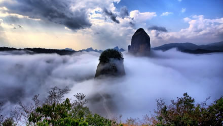 武岡云山,云山,湘西南名山,屬雪峰山余脈,以云多奇幻而得名。位于武岡市城南5千米處,東西綿延數(shù)十里,毗連著武岡、新寧、城步三縣疆界。最高峰海拔1372.5米,為國家級森林公園和國家3A景區(qū)。分伴山?jīng)_、云山堂、紫霄峰幾大景區(qū),景區(qū)中云海、古樹、流泉、溪澗、瀑布、幽谷、山峰、怪石、古剎、靈寺、古道、古跡一應俱全,被譽為"楚南勝地"。始建于三國吳國時勝力寺,寺廟面積2500平方米,寺內(nèi)有彌勒殿、大雄寶殿、觀音殿等,建筑完好,為湘西南著名的宗教文化活動場所和游覽勝地。1982年被列為國家自然保護區(qū),1992年9月經(jīng)原國家林業(yè)部批準建立國家級森林公園。