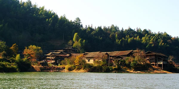 苗族寨落大多依山傍水,或在山?jīng)_,或在溪畔。村前寨后,喜植楓、椿、樟、梧,雜以棕櫚崐修竹。住宅大多為木結(jié)構(gòu)建筑。其中雙層重檐木質(zhì)卯榫結(jié)構(gòu)的吊腳樓最有特色。吊腳樓下空間為牲畜圈、灰屋和廁所,一樓為住所,二樓為放置糧食等物的倉(cāng)庫(kù),一般四排三間,一正一橫;也有的六排五間,一正兩橫。一樓面前有較寬的走廊,連接中堂與橫屋。走廊靠檐邊裝有帶靠背的長(zhǎng)條板凳。