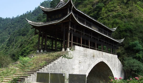定遠(yuǎn)橋 定遠(yuǎn)橋位于綏寧縣關(guān)峽鄉(xiāng),是綏寧縣知縣范成龍捐獻(xiàn)自己的俸祿銀子于康熙二十三年(1684年)修建。橋長(zhǎng)一十二丈六尺,寬二丈六尺,高五丈六尺,單孔,半圓拱。橋面用青石鋪面,青石已被磨得油亮發(fā)光,橋頂屋架木瓜、懔條緣皮、青瓦翹檐、瓦頭潔白,橋依山而建,古樸威嚴(yán);亭為杉木架構(gòu),卯榫嵌合,不用一釘,圓石為礎(chǔ),巨木為柱,片板為欄,長(zhǎng)方為座,可供憩息,可避風(fēng)雨。由于這里的險(xiǎn)關(guān)隘口天然生成,為歷代兵家要塞,故名關(guān)峽;現(xiàn)為湖南省保護(hù)文物; 橋下的“蘭溪”溪水清澈見(jiàn)底,水流湍急,水似一把利刃,把猴子山一劈兩開(kāi)穿山而過(guò)。 |