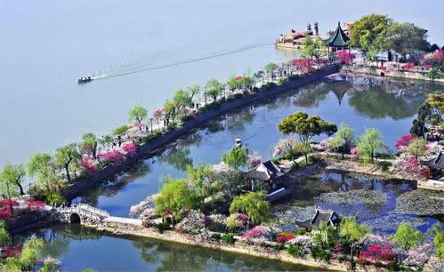 南堤春曉 四季亭南,沿湖筑大堤半圍,陽春三月,堤上300余株垂柳,柳枝飄曳,400余株桃花競相吐艷。一湖碧水,數(shù)峰青山,分外妖嬈。長堤西南角臨湖屹立六角亭,綠瓦紅柱,亭內(nèi)12根楞木上雕有60只金鳳凰,每5只鳳凰由一條龍率領(lǐng)。正中繪以雙龍戲珠,故俗呼“龍風(fēng)亭”。亭上懸“月波平眺”額,亭旁有游船碼頭,通黿頭渚風(fēng)景區(qū)。