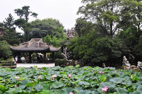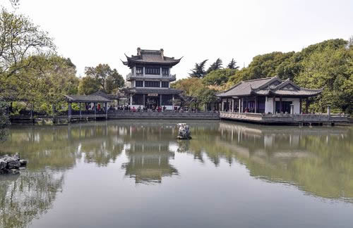 春秋閣東南下,有面闊五間、平挑入水、半架河上、前設(shè)半亭的水榭。延伸處有貼水平臺,三面圍以欄桿,中開方洞,露出水面一方,名“問魚淵”。時見小魚悠游,伸手可掬。水榭中間,由費(fèi)新我書“層波疊影”額。水榭連廊,穿過春秋閣直通數(shù)魚檻,其中一段架于水面,故名“水旱廊”。數(shù)魚檻緊倚千步長廊,面闊七間,臨水而筑,池對面建有半亭,是從西水仙廟遷來。密密斗拱托撐飛檐之頂,古色古香。穿亭向前,有延伸入池的半島,上建六角攢尖的“綠漪亭”。 假山群在蠡園入口和“層波疊影”之間。一大片湖石堆疊而成的奇峰,嶙峋多姿,氣勢不凡。一條石徑,盤旋曲折,忽高忽低,忽寬忽狹,忽明忽暗。置身其間,聞聲不見人,可望不可即,如入迷宮。假山都以“云”字為題,有“云窩、云腳、穿云、朵云、