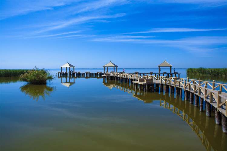 哈素海水質(zhì)肥沃,湖內(nèi)蘆葦叢生、鳥飛魚躍。岸邊涼亭水榭柳綠成蔭,碧水青山相映成輝,有"塞外西湖"之稱。置身哈素海,極目遠(yuǎn)眺,只見晴空碧水,蔚藍(lán)一色,蒲萍叢叢,你會覺得哈素海宛如已一副淡雅的水墨畫。如果你停舟湖中,看對對歐鳥翻飛底空,群群野鴨出沒葦叢,聽遠(yuǎn)處高亢聊亮的漁歌,近旁魚躍出水波剌剌的 聲響,你會感覺到哈素海像一首詩。