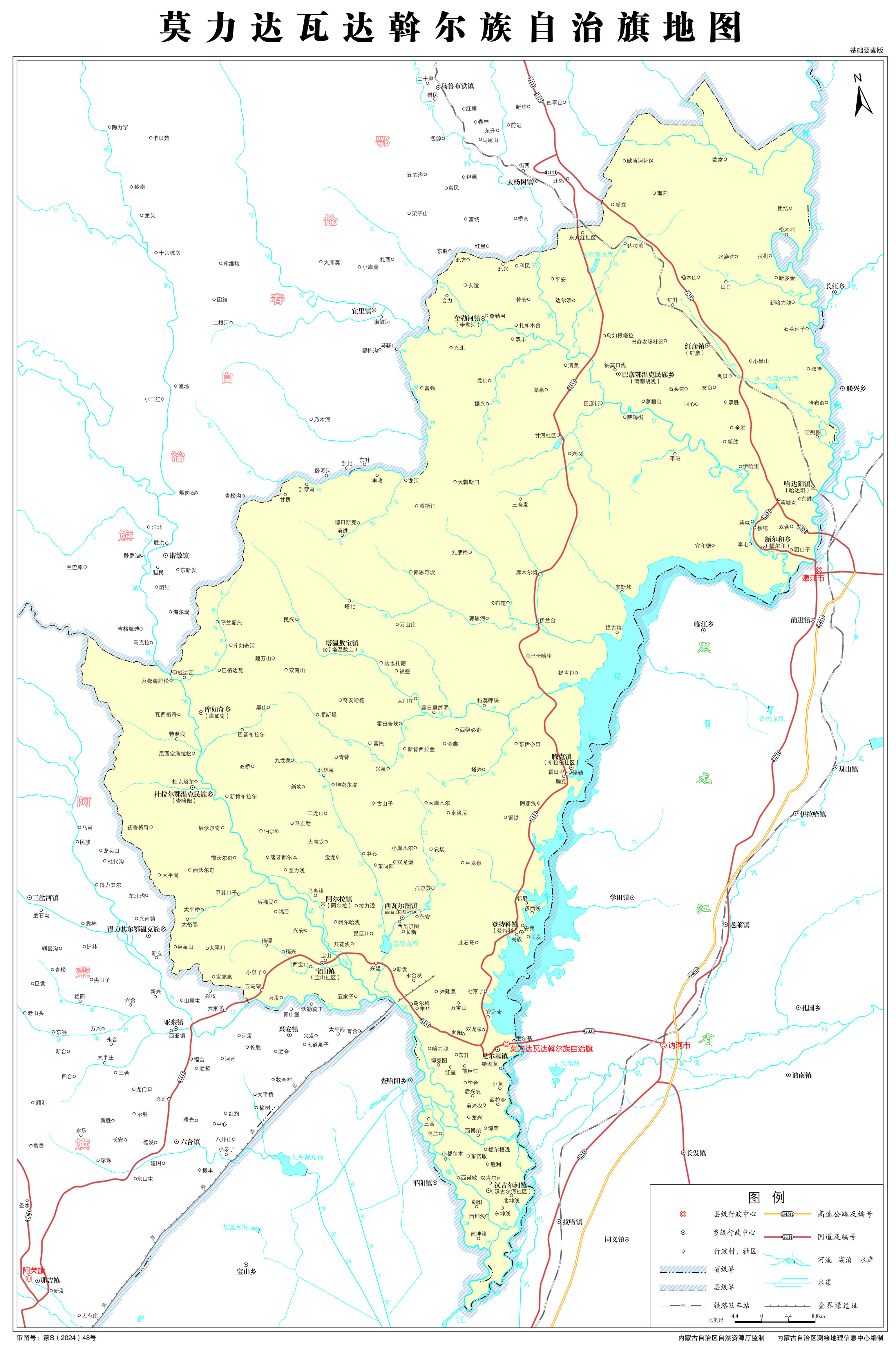 鎮(zhèn):尼爾基鎮(zhèn)、紅彥鎮(zhèn)、哈達陽鎮(zhèn)、漢古爾河鎮(zhèn)、阿爾拉鎮(zhèn)、西瓦爾圖鎮(zhèn)、寶山鎮(zhèn)、塔溫敖寶鎮(zhèn)、奎勒河鎮(zhèn)、騰克鎮(zhèn)、登特科鎮(zhèn)
