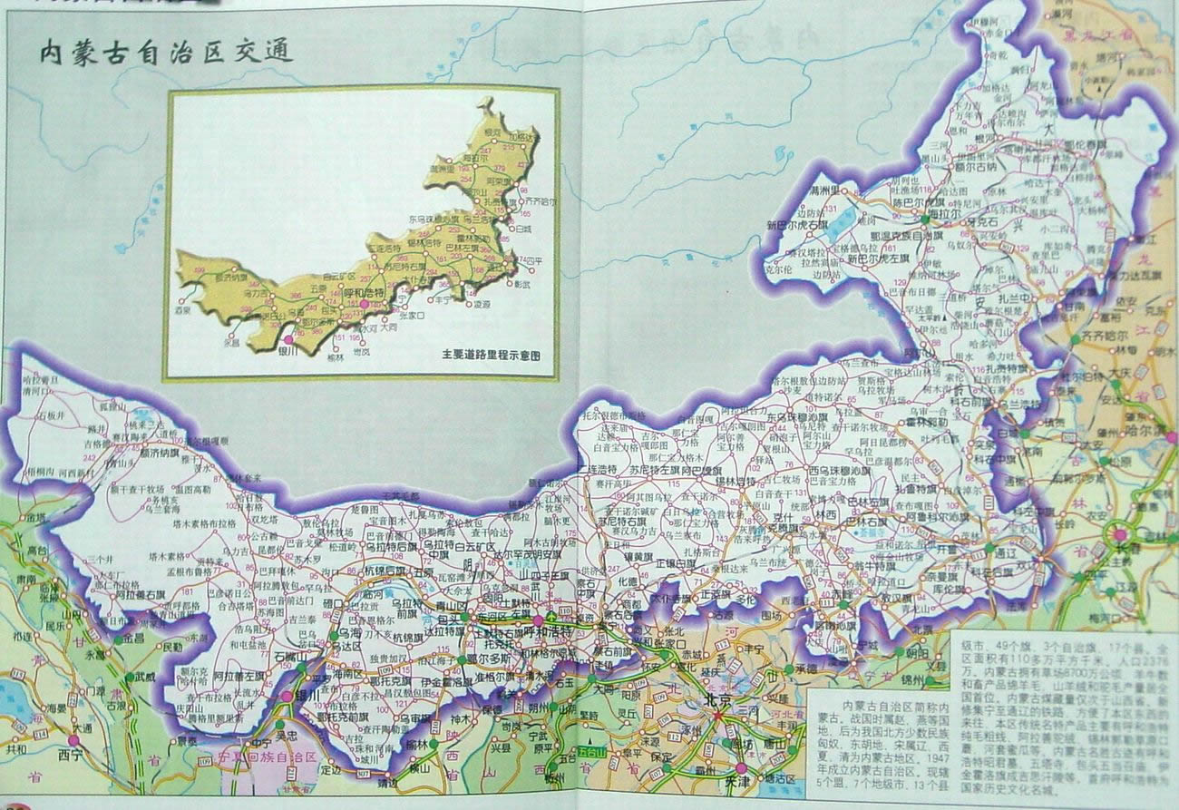 內(nèi)蒙古已形成了以首府呼和浩特市為中心的鐵路、公路、民航組成的綜合交通運輸網(wǎng)絡(luò)。主要鐵路干線有京包線、京通線、包蘭線、濱洲線、集二線;由于該區(qū)城市少而分散,地勢平坦,因此適宜發(fā)展公路交通。公路網(wǎng)以國道為骨干,干支線相結(jié)合,溝通各盟市旗縣的交通網(wǎng)絡(luò).....