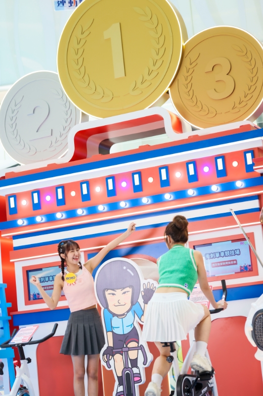 寓意慶祝勝利的凱旋門上方豎立著所有運動員都渴望于這國際體壇舞臺贏取的金銀銅牌,寄托了對我國運動員的美好祝福,游客更可參與單車互動競技游戲,踏上單車裝置與現(xiàn)場“小女車神”齊齊破風,以最快速度完成200米計時賽競逐“車神”寶座。