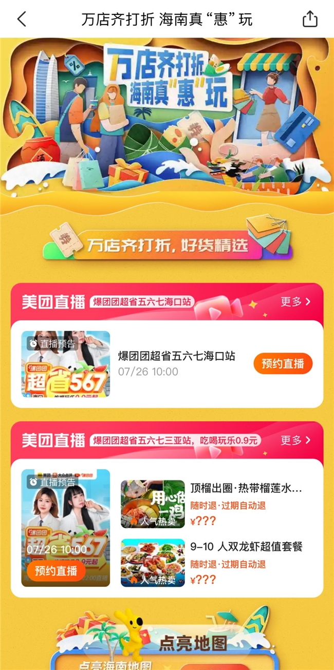 “萬店齊打折 海南真惠玩”主題營銷活動(dòng)由海南省旅游和文化廣電體育廳和美團(tuán)聯(lián)合發(fā)起,活動(dòng)覆蓋了海南省內(nèi)十八個(gè)城市,全品類商家紛紛參與,為游客們帶來了前所未有的優(yōu)惠和福利;顒(dòng)期間海南省旅文廳聯(lián)合美團(tuán)攜手一萬家商戶,為廣大消費(fèi)者和游客提供了不低于1000萬遠(yuǎn)的補(bǔ)貼折扣,用戶只要在美團(tuán)App、大眾點(diǎn)評App搜索“萬店齊打折”等字樣,即可進(jìn)入專題頁,參與各類福利活動(dòng)。