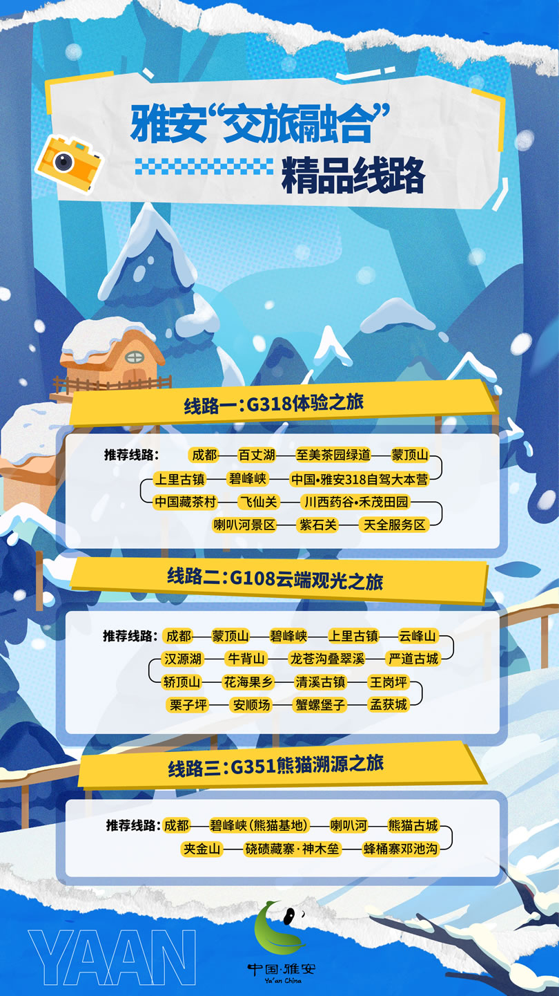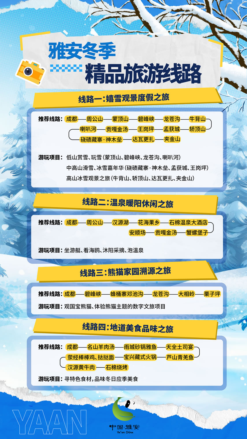 這個(gè)冬天,雅安市圍繞冰雪、溫泉、熊貓、美食,推出4條冬季精品旅游線路,圍繞國道318、108等交旅資源,推出3條“交旅融合”精品線路,最大程度滿足游客的冬游需求。將以冰雪為序,溫泉為媒,熊貓為邀,美食為禮,誠邀四方游客共赴一場難忘的旅行盛宴,邀請各地游客來“綠美雅安 熊貓家園”暢享冰天雪地的快樂,盡享溫泉暖陽的愜意,邂逅“風(fēng)花雪月”的故事。