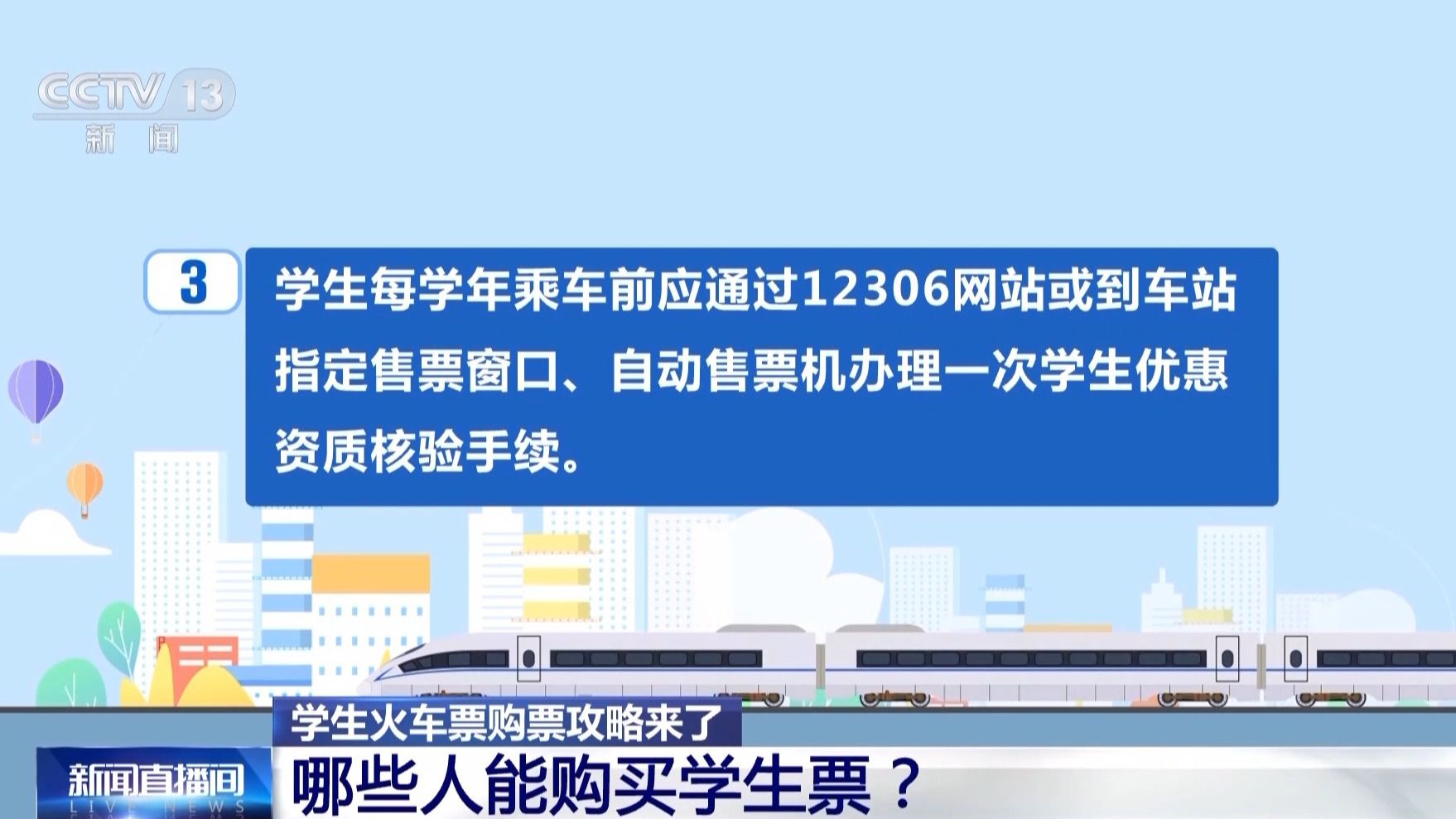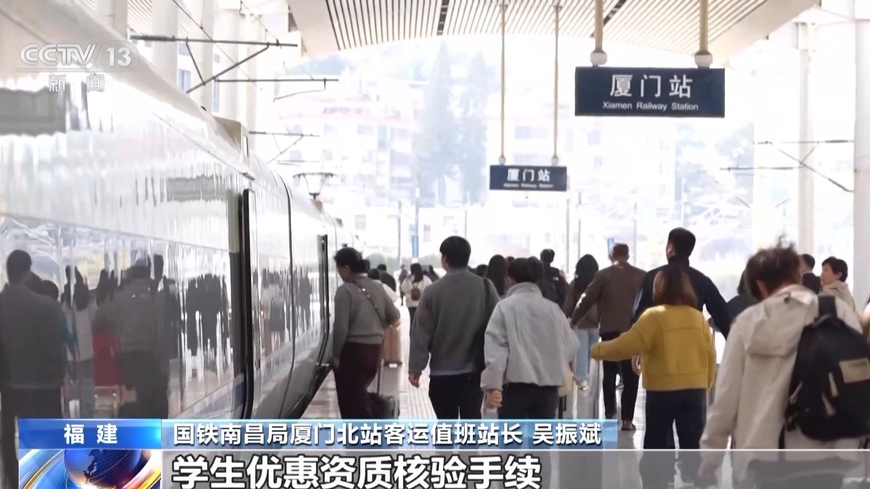國鐵南昌局廈門北站客運值班站長 吳振斌:現(xiàn)在中國高等教育學生信息網和鐵路12306系統(tǒng)已實現(xiàn)信息對接,學生旅客每學年乘車前可通過鐵路12306App在線辦理學生優(yōu)惠資質核驗手續(xù)。