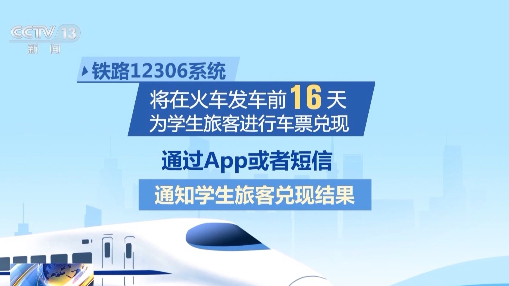 鐵路12306系統(tǒng)將在火車發(fā)車前16天為學生旅客進行車票兌現(xiàn),并通過App通知或者短信通知學生旅客兌現(xiàn)結果。車票兌現(xiàn)成功后,學生旅客需在當日23時前,在鐵路12306App中完成預約購票訂單支付。