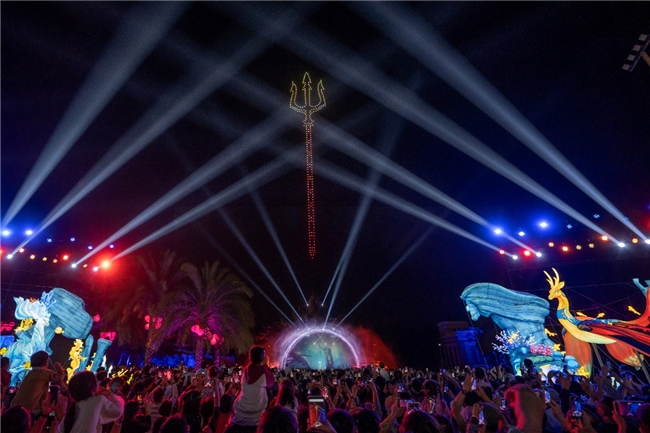 活動(dòng)期間,每晚都會(huì)上演《深?駳g》無人機(jī)水幕秀。視頻內(nèi)容通過人工智能建模技術(shù),實(shí)現(xiàn)了角色形象的高精度三維重建,構(gòu)建出具有高度真實(shí)感和動(dòng)態(tài)表現(xiàn)力的虛擬角色。隨著劇情的推進(jìn),數(shù)百架無人機(jī)在夜空中變幻多種圖案,點(diǎn)亮海棠夜空,演繹出獨(dú)屬于亞特蘭蒂斯的海底狂歡。