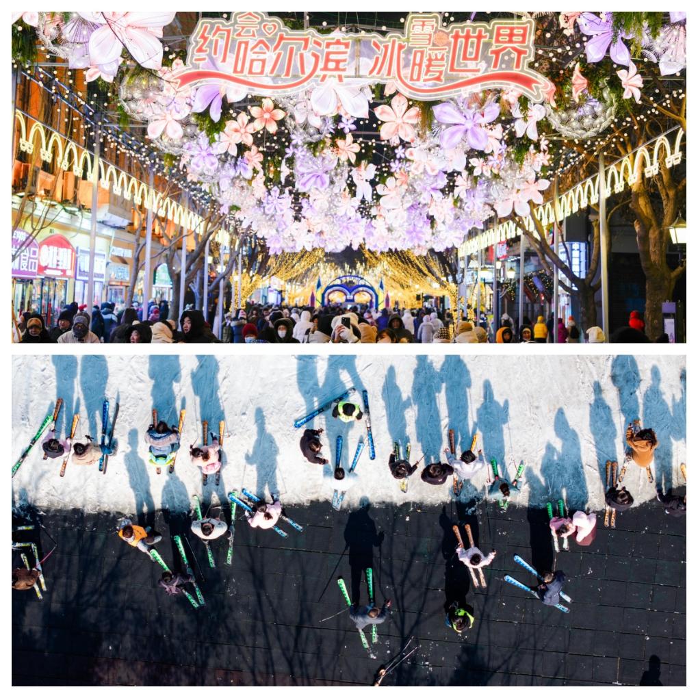 拼圖:(上圖)1月30日,游客在哈爾濱中央大街上游玩、拍照。(下圖)2月3日,游客在江蘇省淮安市馬頭鎮(zhèn)的古運河滑雪場滑雪(無人機(jī)照片)。