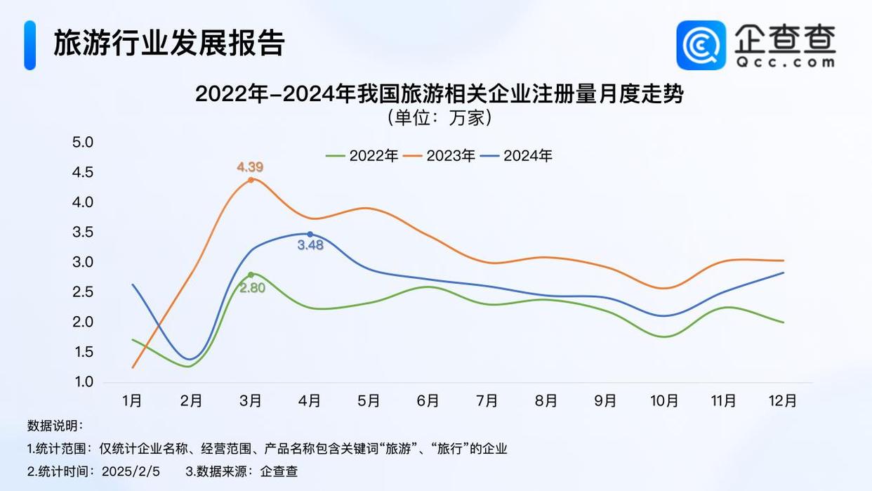 企查查數(shù)據(jù)顯示,2024年,我國累計注冊31.3萬家旅游相關企業(yè),分月份來看,4月相關企業(yè)注冊量達3.48萬家,是全年注冊量最高月份;從2022年至2024年我國旅游相關企業(yè)注冊量月度分布來看,每年的3月、4月是旅游相關企業(yè)注冊高峰期。