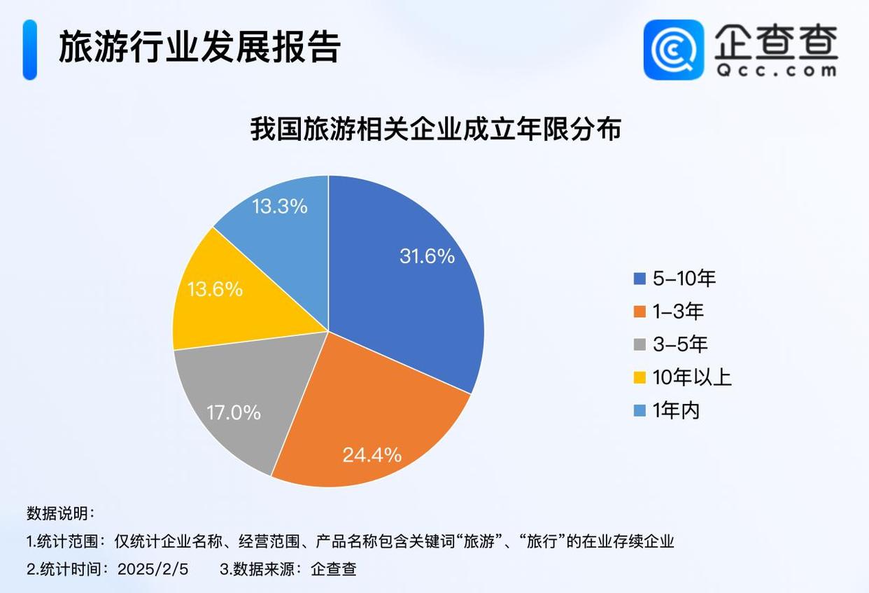 企查查數(shù)據(jù)顯示,2024年我國累計注冊31.3萬家旅游相關企業(yè),其中4月注冊量最高,達3.48萬家,3月、4月是近三年旅游相關企業(yè)注冊高峰月份。企業(yè)存量方面,我國現(xiàn)存220.4萬家旅游相關企業(yè),其中成立年限在5-10年的企業(yè)最多,占比超三成。
