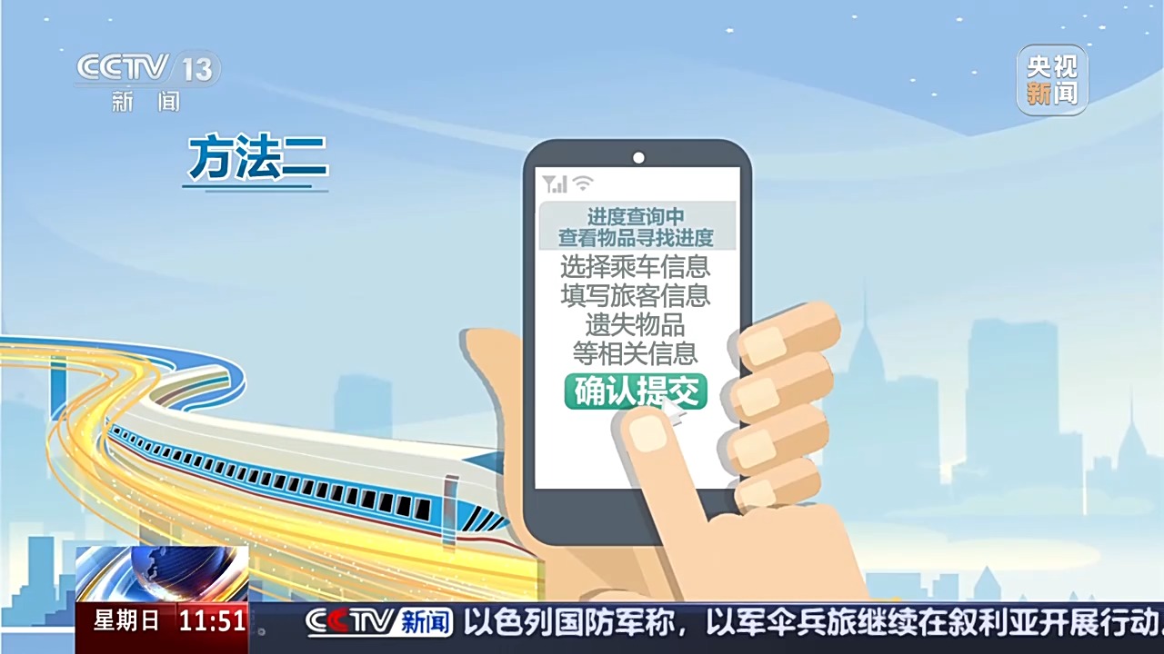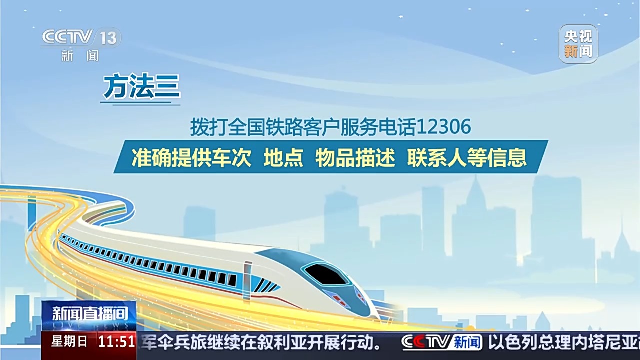 方法三:撥打全國鐵路客戶服務(wù)電話12306,準(zhǔn)確提供車次、地點(diǎn)、物品描述、聯(lián)系人等信息,鐵路部門將全力幫您查找。