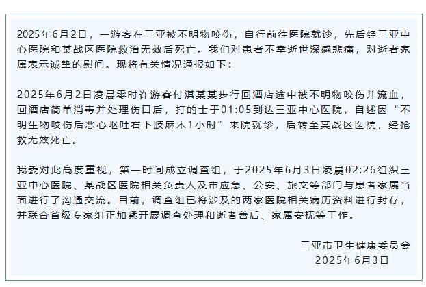 據(jù)“三亞市衛(wèi)生健康委”微信公眾號(hào)消息,6月2日,一游客在三亞被不明物咬傷,自行前往醫(yī)院就診,先后經(jīng)三亞中心醫(yī)院和某戰(zhàn)區(qū)醫(yī)院救治無效后死亡。三亞市衛(wèi)生健康委將有關(guān)情況通報(bào)如下: