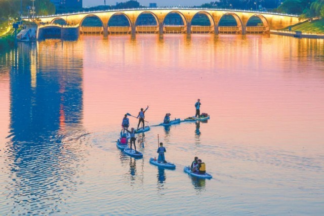 水聲、指導(dǎo)聲,夾雜著成功駕馭后的歡呼聲,交織成大運(yùn)河上獨(dú)特的活力樂章。微風(fēng)拂過,帶來水汽的清涼,也吹散了一些夏日燥熱。阿珂說,俱樂部正在推廣“城市微度假、微旅行”的理念,給年輕人打造一個(gè)不用出遠(yuǎn)門就有休閑度假感的娛樂解壓場(chǎng)景。“大運(yùn)河比城里的護(hù)城河、亮馬河寬闊得多,傍晚時(shí)分波光粼粼的感覺棒極了!濱水休閑步道以及各類配套服務(wù)設(shè)施也挺完善,真的很適合微度假。”他說,接下來希望能帶更多人在大運(yùn)河上體驗(yàn)槳板運(yùn)動(dòng)的快樂。
