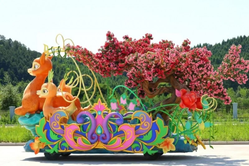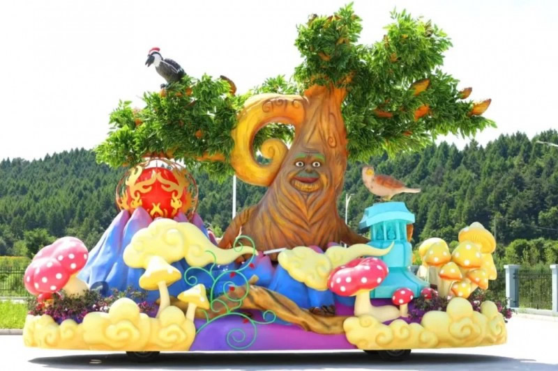 花車設(shè)計不僅注重視覺沖擊力,更融入動態(tài)特效:虎頭擺動、翅膀扇動、雪花機噴灑等細節(jié),讓靜態(tài)的造型煥發(fā)生命力。夜幕降臨時,花車更以夜光效果點亮林海,為觀眾呈現(xiàn)一場光影交織的奇幻盛宴。