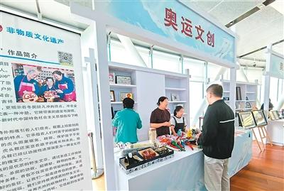 設(shè)在張家口市崇禮區(qū)國家跳臺(tái)滑雪中心內(nèi)的非遺手工藝品展臺(tái)。