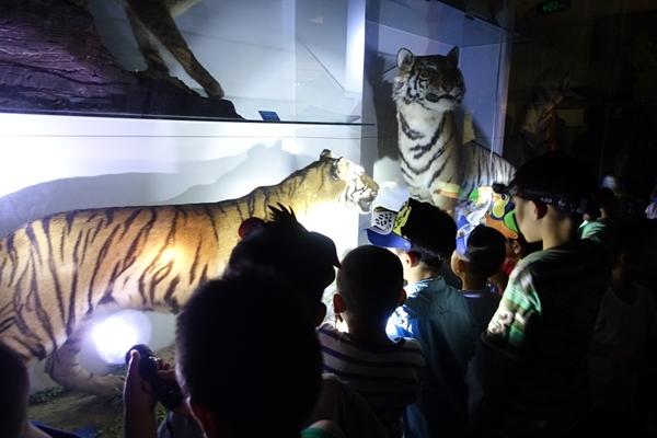 孩子們在國家動物博物館熄燈環(huán)境里用手電筒照明,觀察孟加拉虎和東北虎標(biāo)本。受訪者供圖