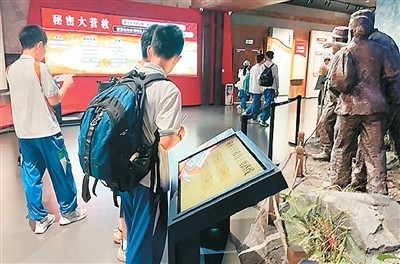 游客步入館內(nèi),仿佛踏入歷史的洪流。全息投影、文物陳列、場(chǎng)景復(fù)原等技術(shù)打造出數(shù)字化展陳空間。曾經(jīng)只能在文字和圖片中描繪的歷史場(chǎng)景,如今栩栩如生地呈現(xiàn)在眼前。在秘密大營(yíng)救展區(qū),雕塑還原文化名人在游擊隊(duì)員護(hù)送下離開(kāi)的場(chǎng)景,當(dāng)觀眾點(diǎn)擊多媒體互動(dòng)裝置選擇不同的撤退路線時(shí),大屏幕會(huì)動(dòng)態(tài)還原當(dāng)時(shí)驚險(xiǎn)的轉(zhuǎn)移路徑,讓人如同身在其中,真切感受到革命先輩在槍林彈雨中的英勇機(jī)智。來(lái)自廣州的黃同學(xué)說(shuō):“有了這些多媒體設(shè)備,讓我更直觀了解到當(dāng)時(shí)槍林彈雨的危險(xiǎn)場(chǎng)景,也更好地學(xué)習(xí)了東江縱隊(duì)的歷史。”