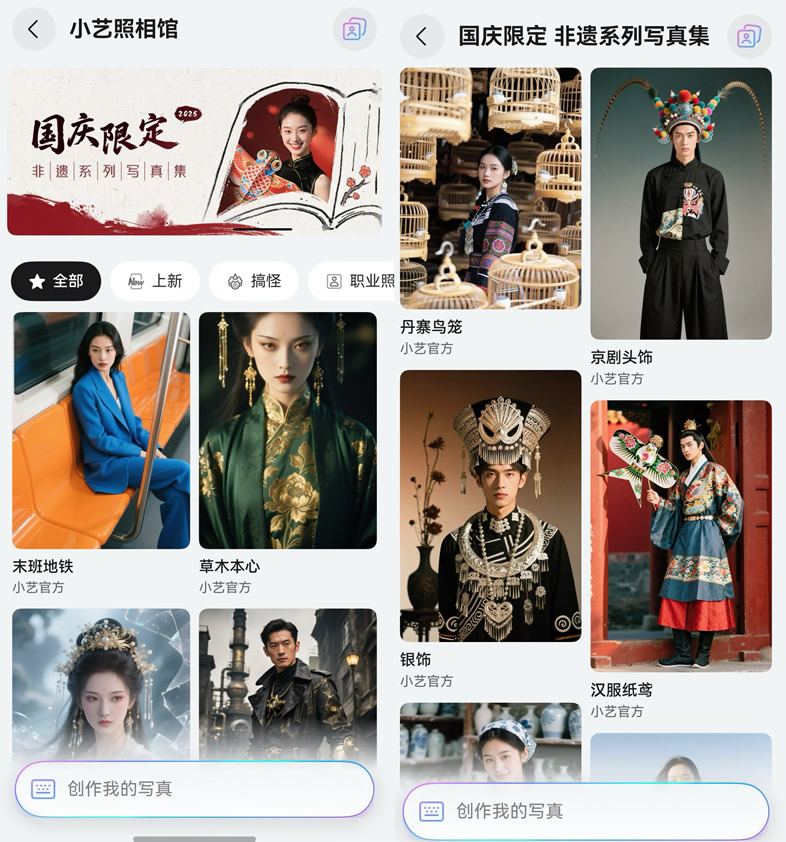 另外,對(duì)于想拍文化感滿滿的國風(fēng)影像的用戶,小藝照相館Agent上線了國慶限定非遺系列模板,進(jìn)入小藝App>右下角發(fā)現(xiàn)>智能體>小藝照相館后,在國慶限定專區(qū)選擇喜歡的模板,然后就可按步驟生成高質(zhì)量的國風(fēng)寫真,打造專屬非遺系列寫真紀(jì)念冊(cè)。