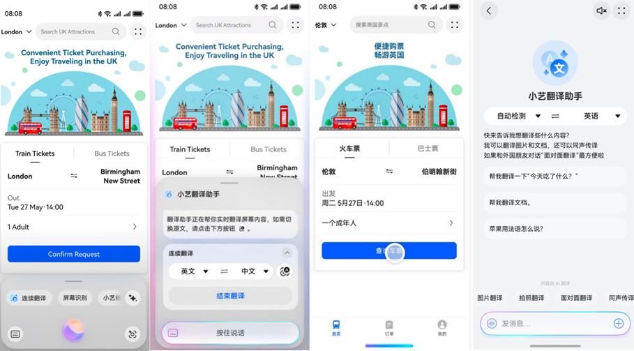 當(dāng)然,小藝的能力遠(yuǎn)不止于此。海外出行時(shí),用戶翻閱外文網(wǎng)站或使用外文App,只需長(zhǎng)按屏幕底部小藝導(dǎo)航條,點(diǎn)擊“連續(xù)翻譯”,或直接喚醒小藝后說“連續(xù)翻譯”,即可體驗(yàn)邊瀏覽邊翻譯的效果。當(dāng)需要與外國友人進(jìn)行面對(duì)面溝通時(shí),使用小藝的面對(duì)面翻譯幫你輕松應(yīng)對(duì)跨語言溝通場(chǎng)景;遇見不認(rèn)識(shí)的外文路牌、菜單,拍照發(fā)給小藝翻譯助手秒翻譯。