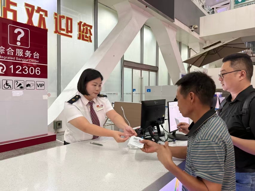 廣州南站綜合服務臺工作人員為旅客辦理業(yè)務,提供12306一站式服務