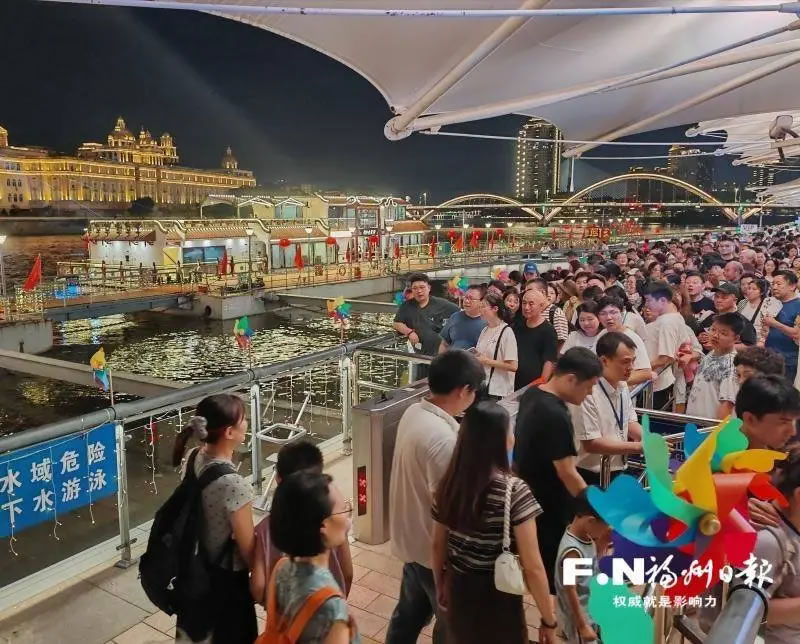 國慶中秋假期,閩江夜游游客流量大增,等待上船的游客排起長隊。(八方客運公司供圖)
