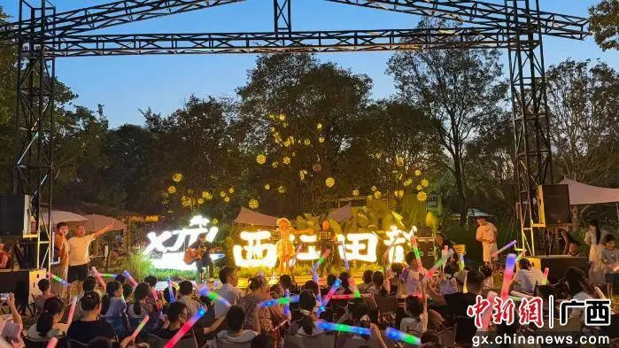 西江田韻休閑營(yíng)地的草坪音樂會(huì)人氣爆棚。每日傍晚,草坪上坐滿游客,主辦方邀請(qǐng)多風(fēng)格樂隊(duì)、歌手現(xiàn)場(chǎng)演出,動(dòng)感流行曲與舒緩民謠交替響起,旋律在田野間回蕩。游客或鋪野餐墊圍坐,或站在草坪邊緣揮舞熒光棒,隨節(jié)奏輕搖,享受獨(dú)特音樂盛宴。