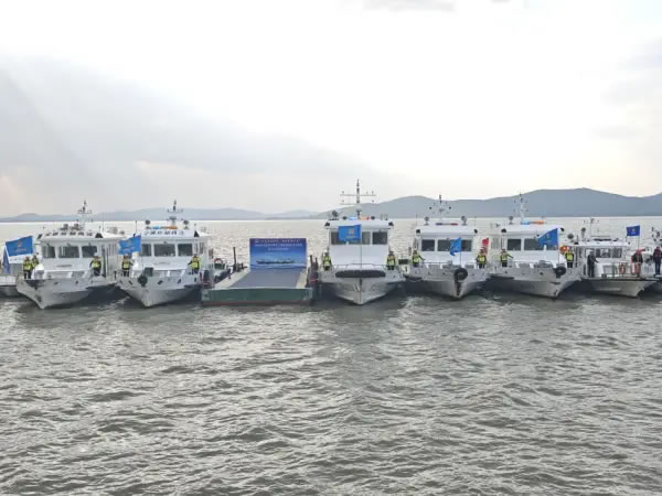 本次演練以“實(shí)戰(zhàn)導(dǎo)向、效果為先”為原則,模擬船舶碰撞、人員落水等極端場景,共分為旅游船舶開航前自查、旅游船舶環(huán)太湖聯(lián)動(dòng)動(dòng)態(tài)監(jiān)測、極端天氣旅游船舶應(yīng)對處置、旅游船舶險(xiǎn)情處置、人員落水應(yīng)急處置5個(gè)科目。其中,旅游船舶開航前自查科目中,對照《中國籍船舶開航前自查清單》嚴(yán)格開展自查工作,確保船舶適航、人員適配,保證航行安全。環(huán)太湖旅游船舶聯(lián)動(dòng)動(dòng)態(tài)監(jiān)測科目驗(yàn)證了現(xiàn)有監(jiān)控系統(tǒng)對湖區(qū)船舶的精準(zhǔn)感知與實(shí)時(shí)管控能力,檢驗(yàn)了跨區(qū)域多部門協(xié)同響應(yīng)機(jī)制的可行性與高效性。極端天氣旅游船舶應(yīng)對處置科目模擬旅游船舶航行途中遭遇極端天氣,“蘇交執(zhí)法錫039”輪、“湖州執(zhí)法艇浙交巡0328”輪迅速進(jìn)入伴航狀態(tài),與游船配合形成“兩艇護(hù)一船”的防護(hù)陣形,全程護(hù)航,實(shí)時(shí)監(jiān)測周邊水域動(dòng)態(tài)、規(guī)避潛在風(fēng)險(xiǎn),主動(dòng)提供必要的航行協(xié)助。旅游船舶險(xiǎn)情處置科目充分展示旅游船舶在航行過程中突發(fā)極端天氣的全過程應(yīng)對處置,包括預(yù)警接收、封航、應(yīng)急避險(xiǎn)、協(xié)同數(shù)援、人員轉(zhuǎn)運(yùn)。人員落水應(yīng)急處置科目中,應(yīng)用無人機(jī)、遙控救生機(jī)器人新型智能裝備與數(shù)字化技術(shù),為最大限度挽救生命提供堅(jiān)實(shí)保障。