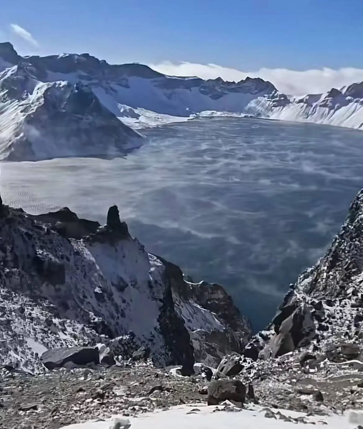 長(zhǎng)白山景區(qū)的一位導(dǎo)游晚晚(化名)當(dāng)天也目睹了“海浩”的奇觀。10月20日上午9點(diǎn)左右,她跟隨景區(qū)工作人員前往天池附近清理道路積雪,來(lái)到北坡一觀景臺(tái)處時(shí),看到在大風(fēng)吹拂下,凝結(jié)的水蒸氣正貼著天池的水面擴(kuò)散、飄動(dòng)。