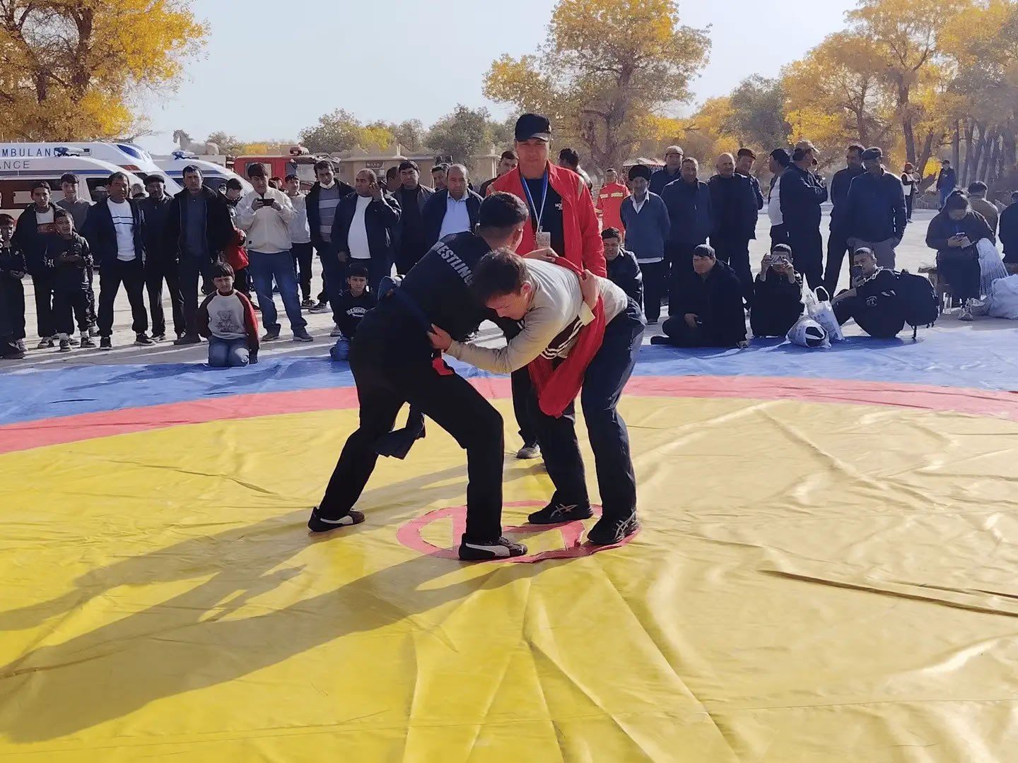 活動(dòng)當(dāng)天,且力西比賽現(xiàn)場(chǎng)熱鬧非凡,眾多體育愛好者與游客紛紛圍攏,目光緊盯著賽場(chǎng)。隨著裁判一聲哨響,摔跤手們迅速進(jìn)入狀態(tài),或蹲下身子穩(wěn)步試探,或主動(dòng)出擊鎖住對(duì)方肩膀。抱腰、絆腿、過肩摔……一系列技巧動(dòng)作如行云流水,剛勁有力又不失靈活。每當(dāng)有精彩對(duì)決上演,場(chǎng)邊便爆發(fā)出陣陣喝彩與加油聲,不少觀眾舉起手機(jī),記錄下這難忘的瞬間。