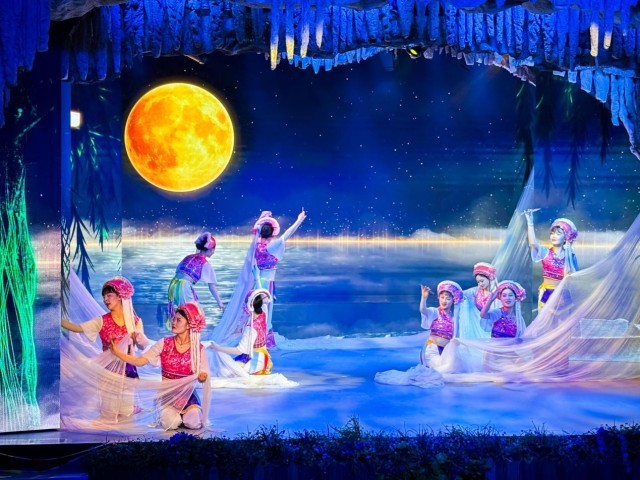 島上的龍宮溶洞是一處天然形成的水下溶洞,全長(zhǎng)約1300米,可以說(shuō)是全國(guó)僅存在水島上的溶洞。洞內(nèi)石柱、石筍、石幔等喀斯特地貌景觀(guān)發(fā)育完整。特別值得一提的是,洞內(nèi)設(shè)有水下劇場(chǎng),每天上演反映白族漁家生活的歌舞表演,成為游客了解當(dāng)?shù)匚幕闹匾翱凇?/p>