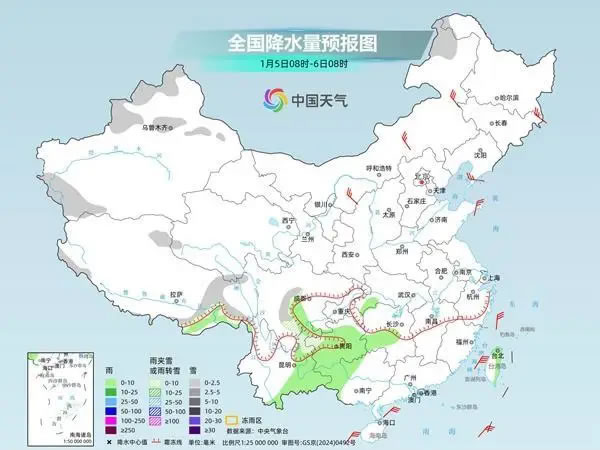 具體來看,中央氣象臺預(yù)計,今天,西北地區(qū)東南部、河南西部、湖北西部、川西高原北部、貴州西北部、青海南部、西藏南部和東部等地部分地區(qū)有小到中雪或雨夾雪;四川盆地、湖北大部、湖南北部、貴州中東部、云南大部等地部分地區(qū)有小雨,其中,云南南部等地部分地區(qū)有中雨。