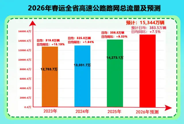 2026年春運將于2月2日開始,3月13日結(jié)束,共計40天。春節(jié)假期小型客車免費通行時間為2月15日至2月23日。省高速公路路網(wǎng)運行監(jiān)測指揮中心研判,春運40天全省高速公路出入口總流量將達到15344萬輛,較2025年春運增長7.5%;日均流量383.5萬輛,為平日流量的1.6倍,車流總量有望創(chuàng)歷史新高。