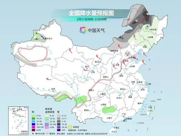 中國天氣網(wǎng)訊 今明兩天(2月21日至22日),我國天氣將出現(xiàn)轉(zhuǎn)折,長(zhǎng)江以北氣溫沖高回落,并伴有大風(fēng)沙塵天氣。同時(shí),今天夜間起,內(nèi)蒙古東部、東北地區(qū)降雪明顯增強(qiáng),明天起黃淮及以南地區(qū)將有大范圍降雨,部分地區(qū)還將伴有強(qiáng)對(duì)流天氣,對(duì)春運(yùn)返程交通影響較大,公眾出行注意防范。