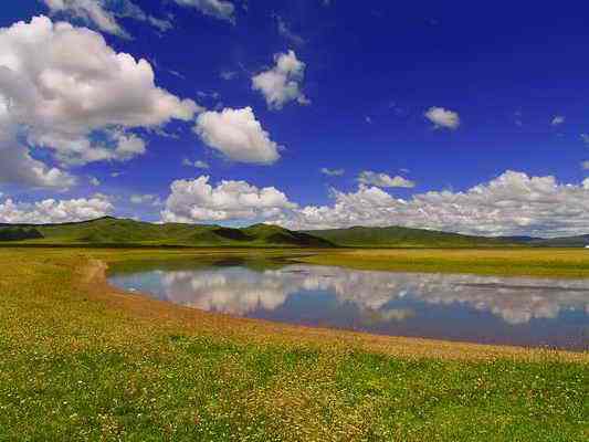 金銀灘的黃金季節(jié)是7、8、9三個月,鮮花盛開,百鳥飛翔,尤其是百靈鳥兒的歌聲,動聽迷人。這里是一片碧草如茵的大草原。浮云般的羊群,棕黑相間的牦牛,星星點點地徜徉在青草和野花叢中。穿著藏服的藏民,騎著駿馬悠然地在草原上緩緩而來。遠處,山巒起伏,偶有雄鷹飛過的身影,蓮花般的蒙古包散落在白云深處。金銀灘草原牧草肥美、牛羊肥壯,人們以金銀遍地來形容這片美麗而富饒的土地,故得名“金銀灘”。