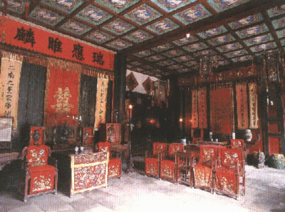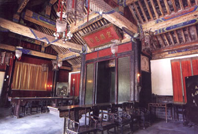 堂內(nèi)兩旁及后部陳列著正一品爵位的儀仗。如金瓜、朝天鐙、曲槍、雀槍、鉤連槍、更鼓、云牌、龍 旗、鳳旗、虎旗、傘、扇等還有一些象征其封爵和特權的紅底金字官銜牌,如
