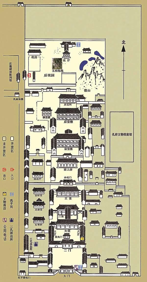 孔府占地240畝,共有廳、堂、樓、房463間。九進庭院,三路布局:東路 即東學,建一貫堂、慕恩堂、孔氏家廟及作坊等;西路即西學,有紅萼軒、忠恕堂、安懷堂及花廳等;孔府的主體部分在中路,前為官 衙,有三堂六廳,后為內(nèi)宅,有前上房、前后堂樓、配樓、后六間等,最后為花園。