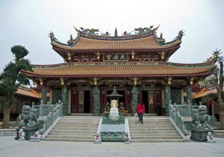 天后宮是天后圣母宮的簡稱,它興修于雍正年間,祭祀海神林默。1938年,天后宮毀于臺(tái)兒莊大戰(zhàn)戰(zhàn)火。今天重建的天后宮,是我國內(nèi)地同類建筑中質(zhì)量標(biāo)準(zhǔn)最高的一座。總建筑面積1508平方米,為二進(jìn)庭院格局。由正殿、左右?guī)俊㈢姽臉堑冉ㄖ䴓?gòu)成。這座建筑,脊飾鏤空灰塑二龍戲珠,線條舒展流暢,木雕精美,彩繪點(diǎn)染,雕梁畫棟,金碧輝煌。
