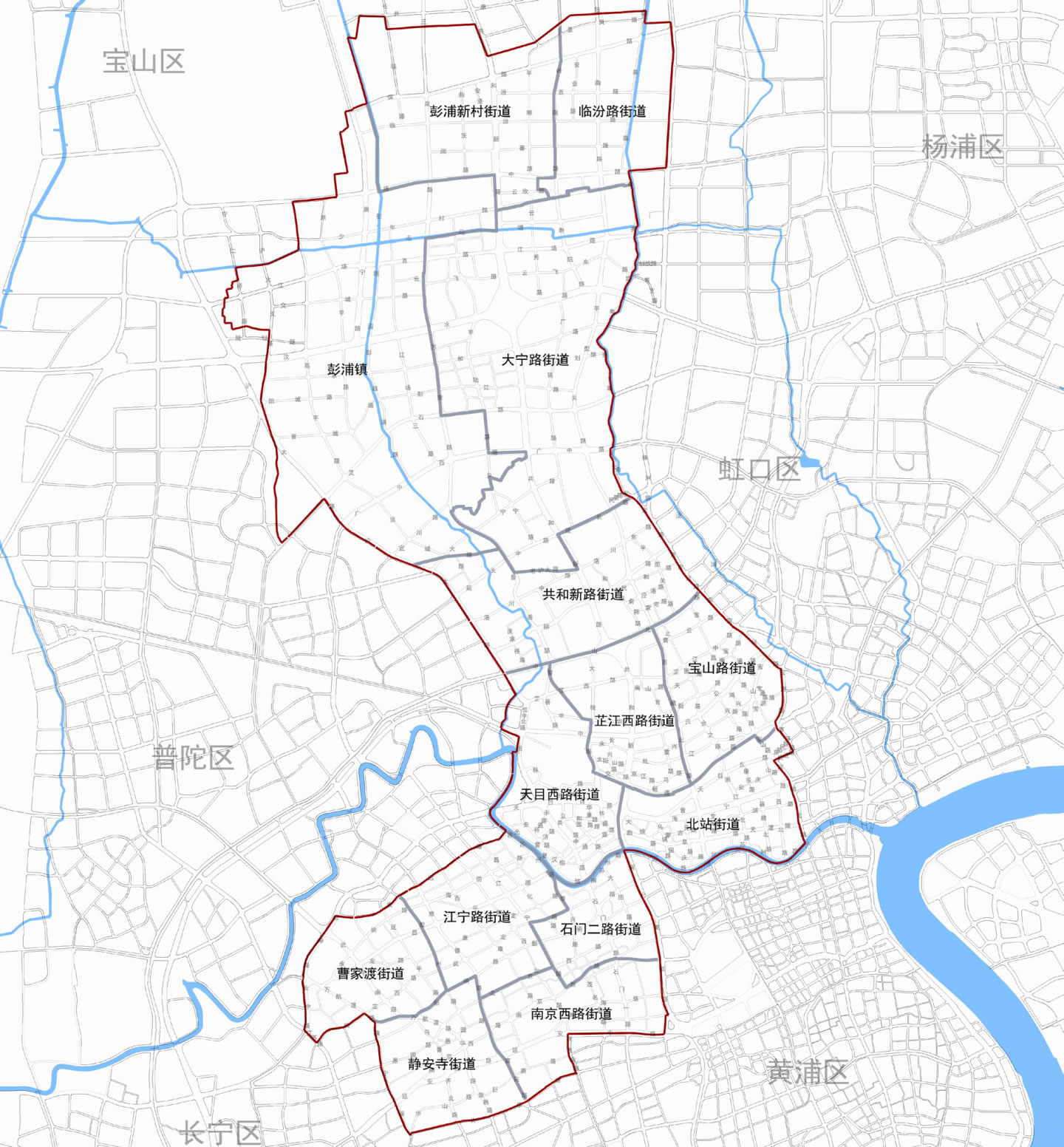 街道:靜安寺街道、曹家渡街道、江寧路街道、石門二路街道、南京西路街道、天目西路街道、北站街道、寶山路街道、芷江西路街道、共和新路街道、大寧路街道、彭浦新村街道、臨汾路街道
