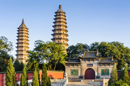 永祚寺雙塔,雄偉異常,雙雙聳立如筆,故有“文筆雙塔”之譽(yù),更被譽(yù)為太原的標(biāo)志。雙塔并非同時(shí)建成,東南塔稍早,西北塔較晚。兩塔相距60米,取“真言密教以十六數(shù)表圓滿無(wú)盡”之意。二塔均為全磚石結(jié)構(gòu),只在各層角檐內(nèi)裝有一根挑木,構(gòu)建技巧十分精湛。