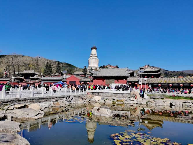 位于塔院寺后,現(xiàn)存建筑為明清兩代所修,寺宇面積八萬余平方米,各種建筑四百余間。中軸線上殿堂七重,自前至后分別為觀音殿、文殊殿、大佛殿、無量殿、千缽殿、銅殿、藏經(jīng)殿。無量殿來說,高達(dá)21米,沒有一根梁木,全用磚塊砌成,外檐磚刻斗拱花卉,內(nèi)雕藻井懸空,形似花蓋寶頂,建造奇特。殿內(nèi)的《華嚴(yán)經(jīng)》字塔,為白綾所組成,上書60多萬字的《華嚴(yán)經(jīng)》,蠅頭小楷,工整秀麗。銅殿三間見方,高達(dá)五米,外面雕鑄著花卉人物,飛禽走獸。