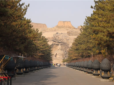 所謂禮佛大道:“恩澤普武周,慈航通法岸”。向西走去,十三對(duì)千佛列柱依次列于禮佛大道兩側(cè)。神柱高8.73米,系黃沙巖雕刻,由下而上依次為須彌座、力士、白象、柱體的完美組合,造型高聳、精致亙絕,在兩側(cè)濃密的松林掩映下,矗立的神柱氣勢(shì)雄偉、蔚為壯觀,仿佛通天入地,也仿佛唯有這樣的神柱鋪成的路才可以叫做禮佛大道。千佛列柱的原型在第9、10窟,第12窟,第14窟等處,均以大象、獅子等神物馱承,立體而又恢弘,呈現(xiàn)出平城時(shí)期北魏皇宮的恢弘模樣。