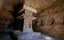 在風(fēng)化殘破的第14窟中,正壁為一佛二菩薩主像,除下層龕像為晚期補(bǔ)刻外,中上層龕像大致有計(jì)劃雕鑿。后室東西壁分作三層:上層以盝形龕交腳菩薩為主體,內(nèi)側(cè)有一小坐佛圓拱龕;中層為較大、較深的坐佛圓拱龕,龕外兩側(cè)為三層出檐閣樓塔;下層深龕仿佛雕刻了帷幔,東壁為坐佛,西壁龕內(nèi)未完成即被改刻。整個(gè)洞窟設(shè)計(jì)嚴(yán)謹(jǐn)、雕刻精美。