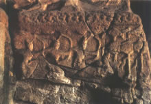 穿過(guò)神柱林立的佛光大道向西,呈現(xiàn)于世人眼前的是兩面相對(duì)的扇形皇家禮佛浮雕墻。這組正面相對(duì)的浮雕墻總體呈圓弧狀,長(zhǎng)約20米、高約4米,畫(huà)面構(gòu)圖完美,雕刻細(xì)致,以高浮雕的形式,生動(dòng)表現(xiàn)了北魏皇家盛大的帝后禮佛圖。車(chē)轔轔、馬蕭蕭的現(xiàn)場(chǎng)氣氛,充分再現(xiàn)了北魏當(dāng)時(shí)皇帝、皇后前往禮佛的莊嚴(yán)肅穆的宏大場(chǎng)面,這種場(chǎng)面讓人自然聯(lián)想到1500多年前云岡石窟作為皇家寺院曾經(jīng)的輝煌,讓人舉目流連。