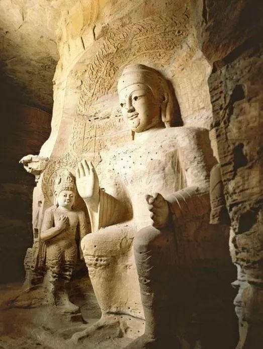 第19窟主佛像結(jié)跏趺坐,佛像耳輪齊肩,下頜崩毀,著袒右肩袈裟,輕薄貼體,衣紋簡(jiǎn)潔明快。佛像右手舉胸施無(wú)畏印,左手掌心向上握法衣于膝上,以表達(dá)佛法的無(wú)畏與傳承。窟外東西耳洞中,各雕刻一尊倚坐佛像,西耳洞佛像,耳廓寬大垂肩,體魄挺拔勁健。這種分窟安置三世佛的布局設(shè)計(jì),既有變化,又顯莊嚴(yán),是北朝石窟形制的新創(chuàng)舉。